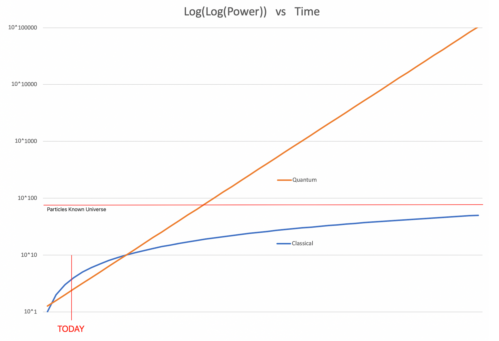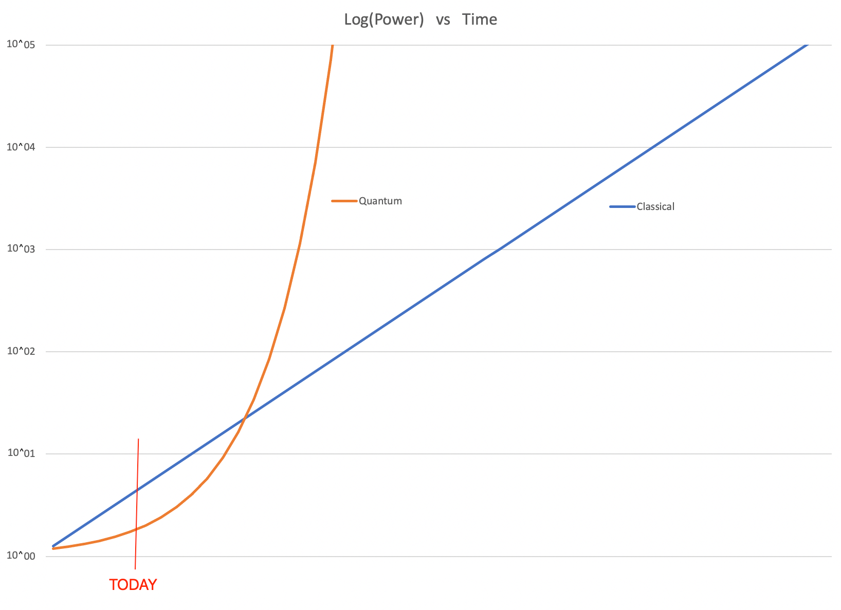 Quantum computers appear as an Exponential function on the same Log-Scale.