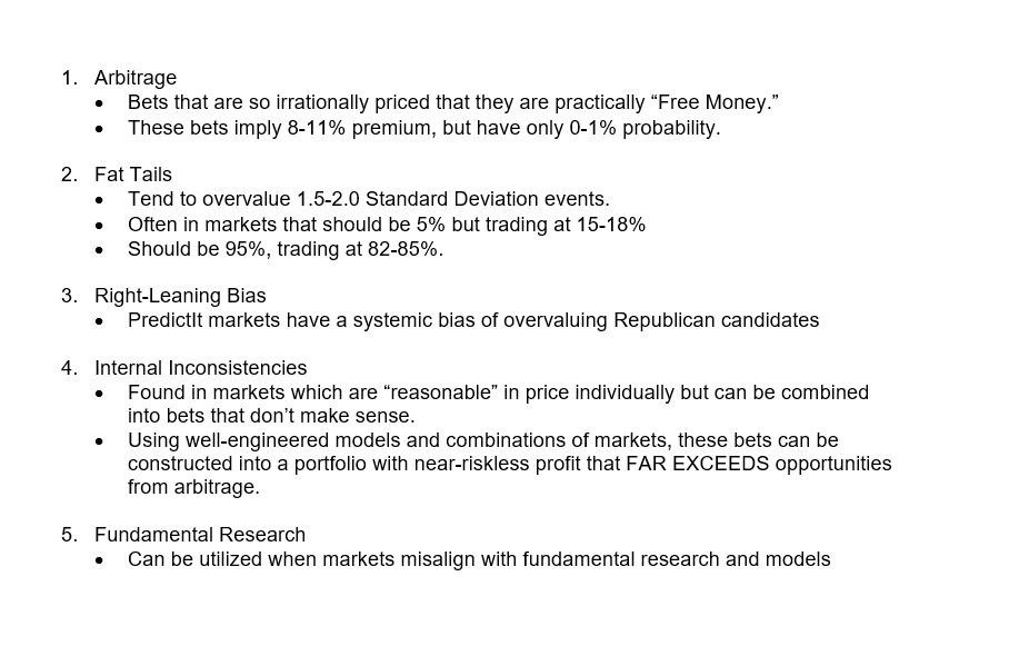 The opportunities profit on PredictIt generally fall into to five categories: