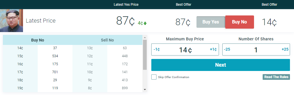 If you were to “Buy Yes”, you would be betting that Kim retaining power through Dec 31 has a probability greater than 87%. You would risk $0.87 to win $1.00 in the hope that it settles in the affirmative.