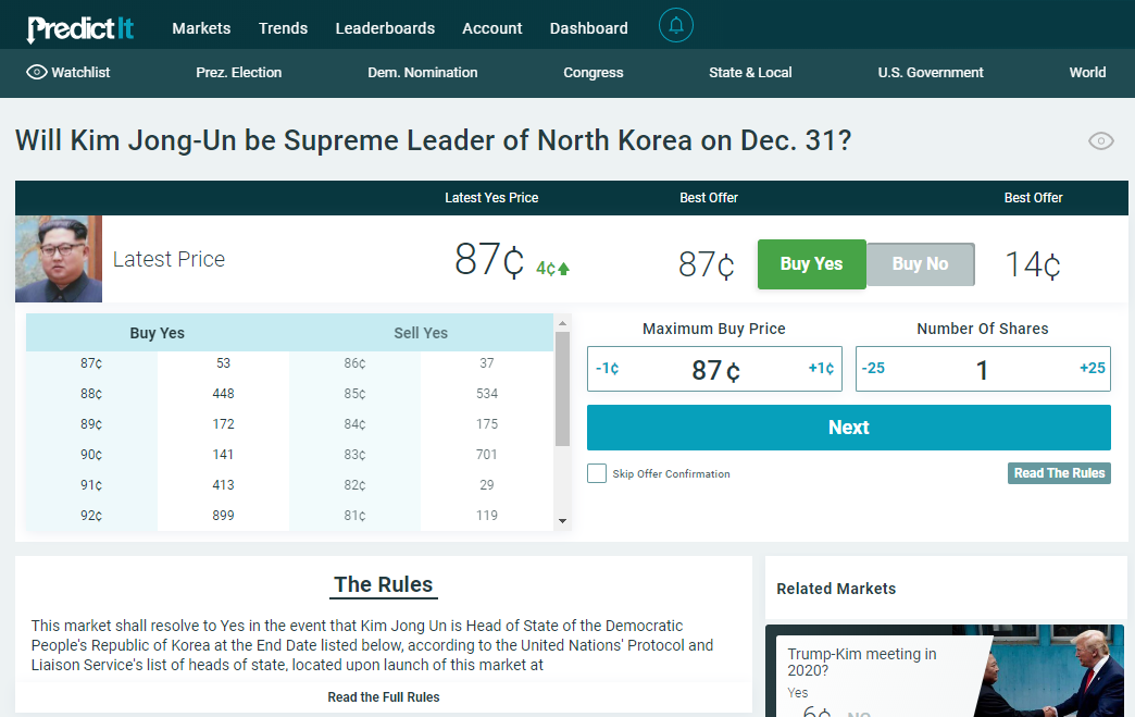 Here’s a market asking if Kim Jong-Un will be the leader of North Korea on Dec 31.