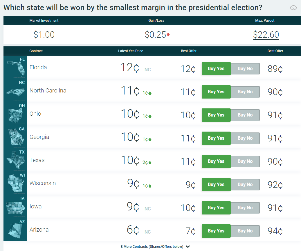 Some markets seek to find the inflection point between the Blue states and Red states. The market “Smallest margin-of-vote state?” is very similar in principle to “Electoral margin?”. “Tipping point state?” is a probability bet on the swing-states and their electoral sizes.