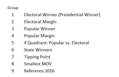 Some markets are high-level, such as presidential winner or popular vote winner. There are markets for individual states and one market for each of the 56 electoral units (50 states, DC, NE 1–3, ME 1–2). These markets are mostly straightforward, ignoring the complexities such as Faithless Electors.