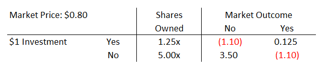 When setting up the Portfolio Management model, there are two ways to set the units. One is to make the fundamental unit = 1 Share (e.g. Buy Yes at $0.80 or Buy No at $0.20). The other method is to set the unit = $1 invested in each asset.