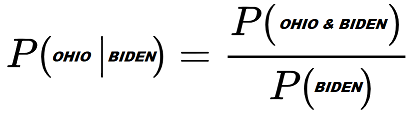 The way to read the left side of the equation is "Probability of Ohio conditional on Biden" or "Probability of an Ohio win given an overall win". 'Conditional on' and 'Given' are often used interchangeably.