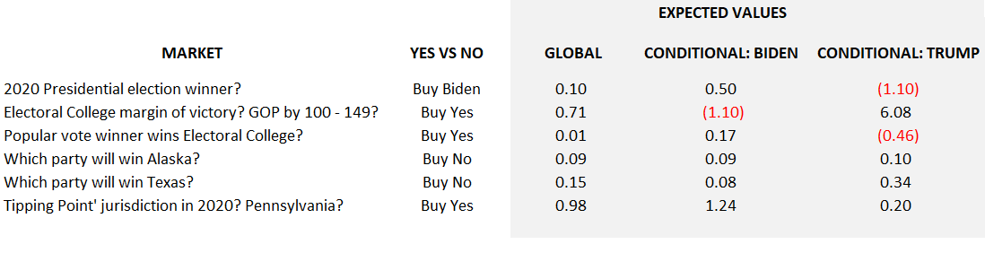 Here’s a table of 6 bets with positive expected value. Notice how the conditional values disperse by Biden vs. Trump: