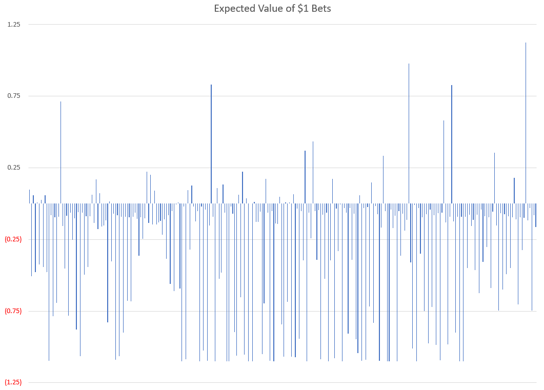 Up to this point, we’ve focused on the global expected value. That is the weighted probability of how much profit a $1 investment would yield across all 10,000 simulations.