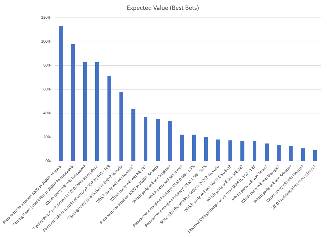 Other markets like Alaska, Texas and tipping point Pennsylvania are winning bets in either case. They may have a general slope toward one candidate, but the expected return is positive in either case.