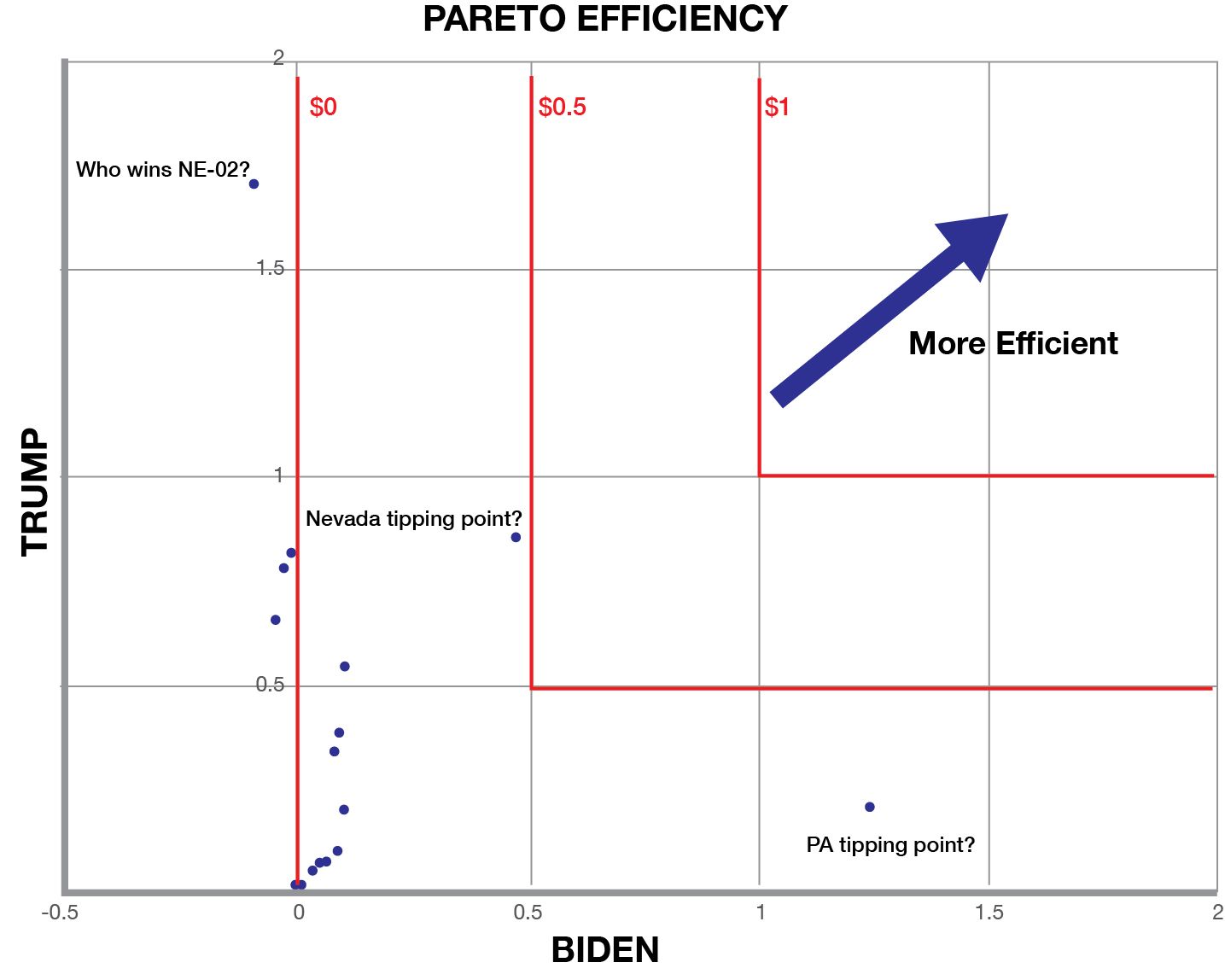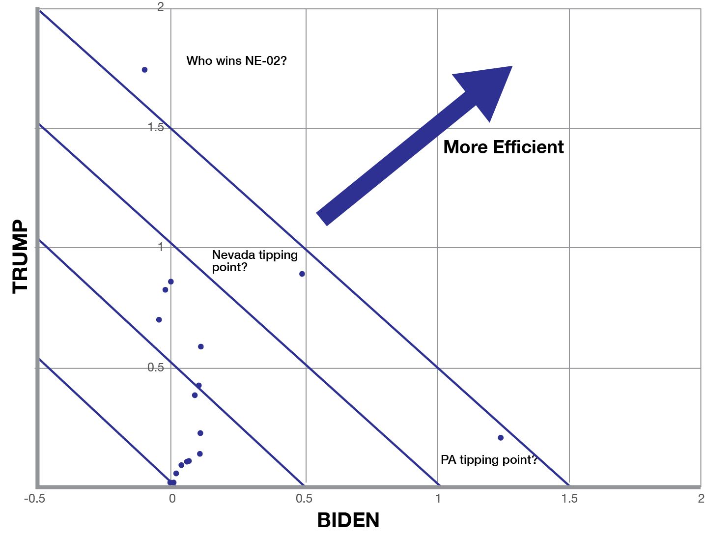 By this metric, Nevada tipping point is the best bet followed by Pennsylvania. But Nebraska-02 is now among the least desirable investments.