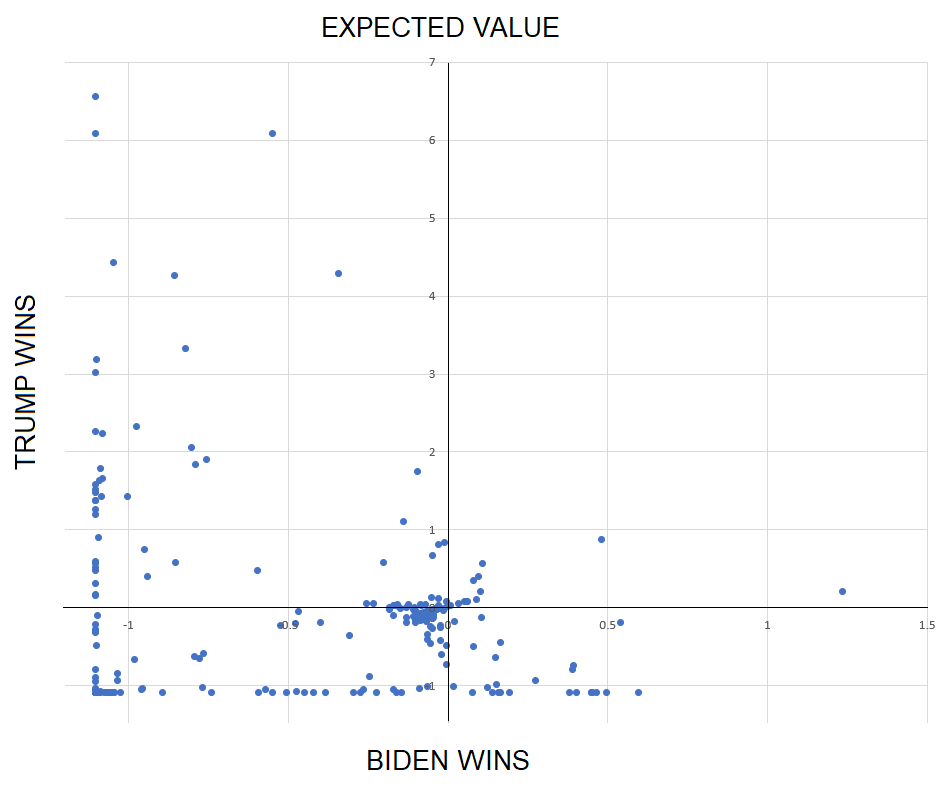 Most of the bets are actually a bad investment whether Trump wins or Biden. This is the lower-left quadrant of the graph.
