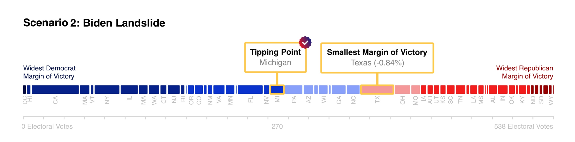 As an example, here is a simulation where Texas has the smallest margin of vote (closest race). Since Texas is typically a safe bet for Republicans, this implies that Biden has won the majority of the map.